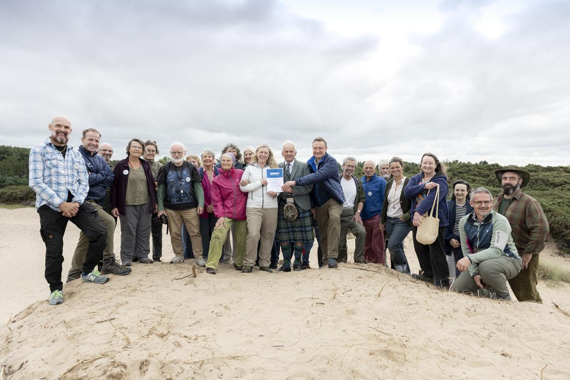 The Cabinet Secretary for Climate Change and Energy, Gillian Martin, and Nick Halfhide, CEO of Nature Scot, presented the award to Jonathan Caddy, Chair of the Findhorn Hinterland Trust, in recognition of the conservation work done in the woodlands and dunes next to the Park.